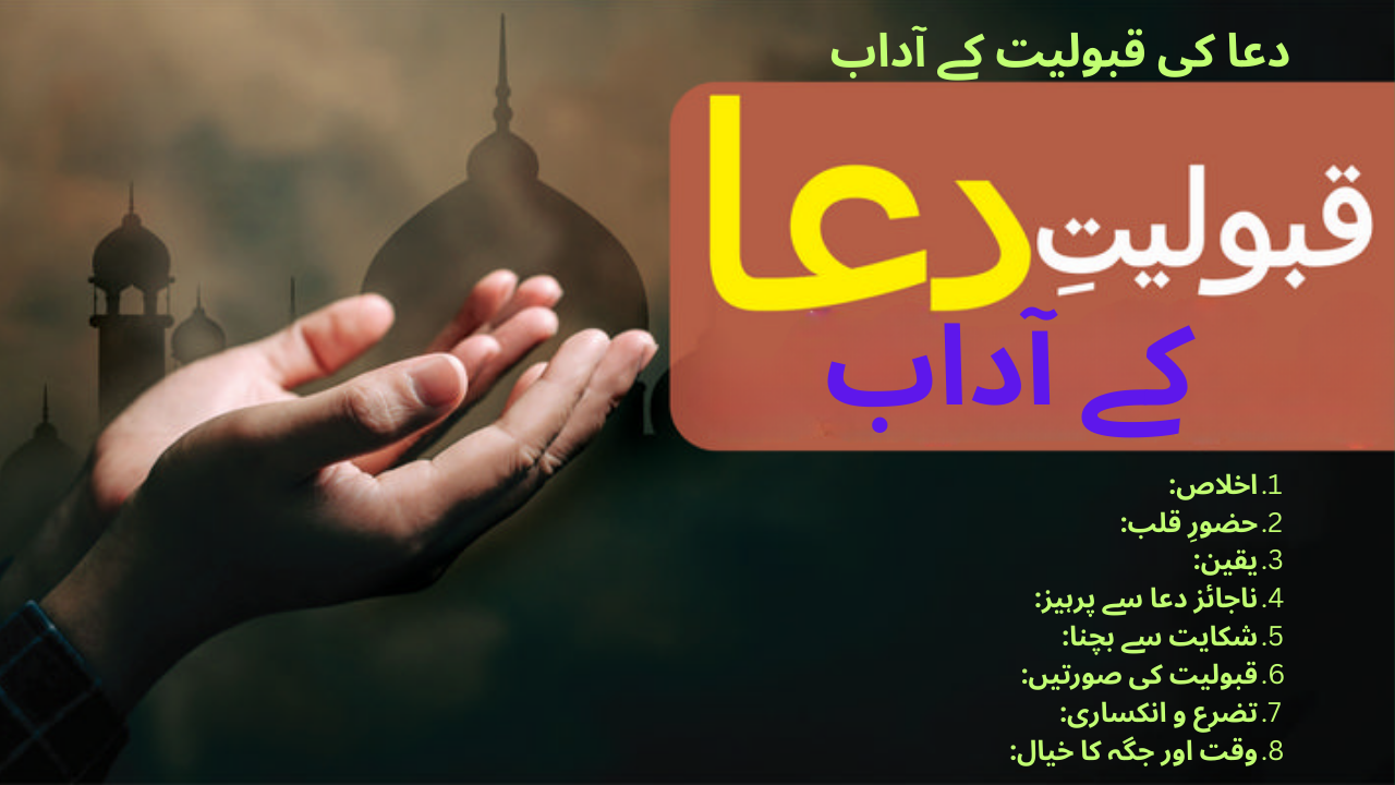 دعا اسلامی تعلیمات میں ایک نہایت اہم عبادت ہے، جو انسان کو اپنے خالق سے براہِ راست رابطہ قائم کرنے کا ذریعہ فراہم کرتی ہے۔ قرآن و حدیث میں دعا کی بڑی اہمیت بیان کی گئی ہے، اور اس کے صحیح آداب پر عمل کرنے سے دعا کی قبولیت کے امکانات بڑھ جاتے ہیں۔ دعا کی قبولیت کے آداب کو چند اہم نکات میں بیان کیا جا سکتا ہے: