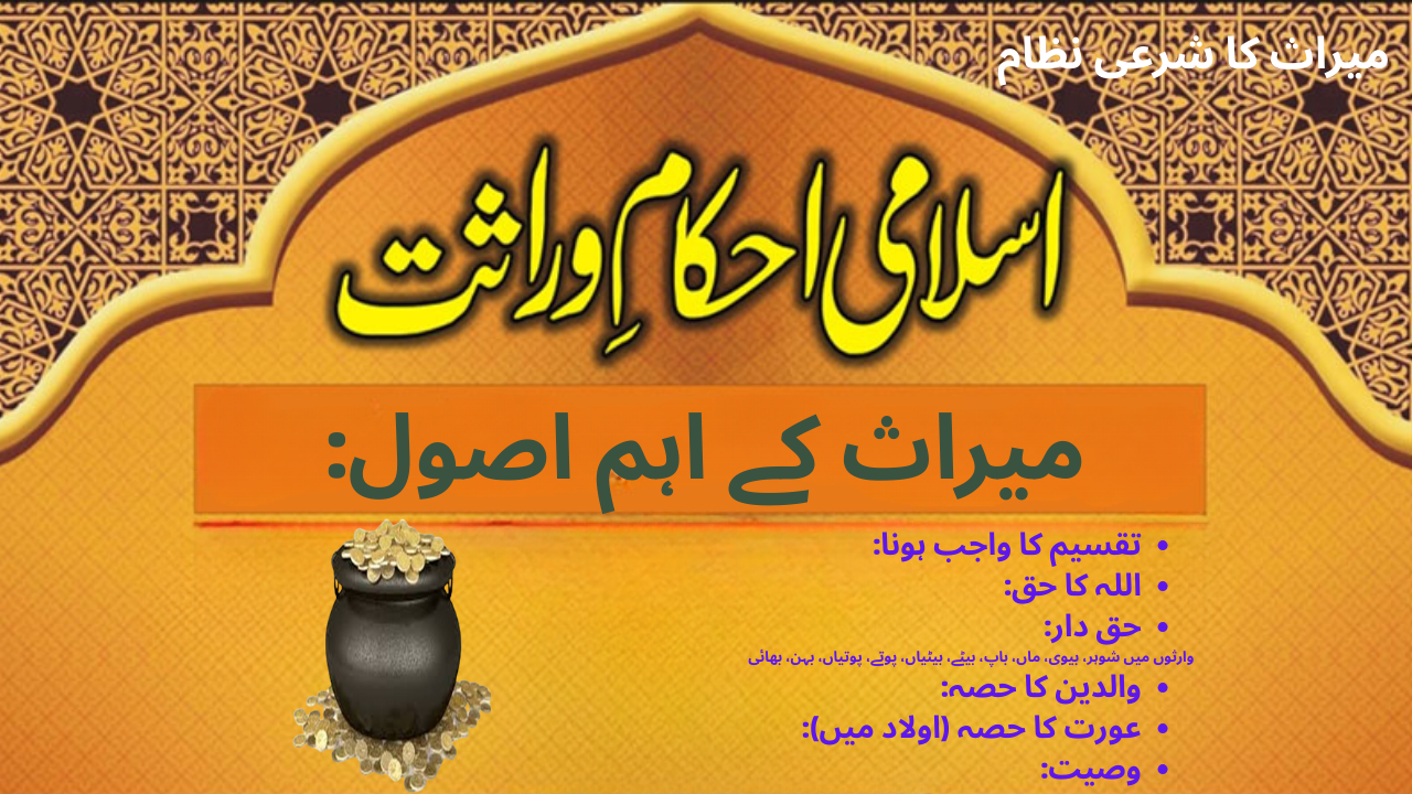 اسلام میں میراث کا نظام ایک مکمل اور منظم طریقہ کار کے تحت مقرر کیا گیا ہے، جو قرآن و سنت کی روشن ہدایات پر مبنی ہے۔ اس نظام کا بنیادی مقصد مال و دولت کی منصفانہ تقسیم، خاندان میں حقوق کی حفاظت، اور معاشرتی انصاف کو فروغ دینا ہے۔